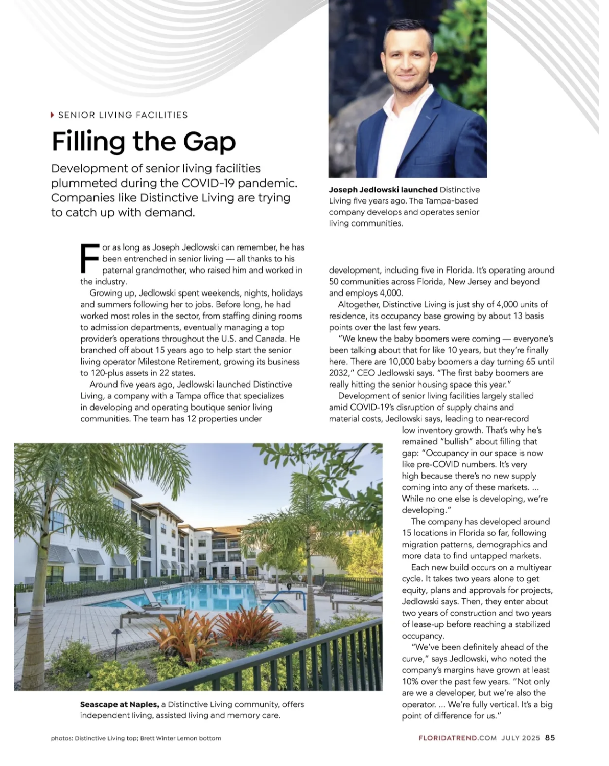 Development of senior living facilities plummeted during the COVID-19 pandemic. Companies like Distinctive Living are trying to catch up with demand. View the full publication by Florida Trend. Read the full article today.